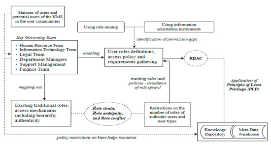 Security on knowledge resources is of higher priority to most organizations. Organizations lose grip of their competitiveness when there is much disregard for knowledge security and protection. Typically, employees in organizations share knowledge through the use of KMS. KMS is defined as the technology-based knowledge management tool used to acquire, store, share, and apply knowledge for improved collaboration and knowledge-value creation. In the KMS environment, users can create, store, share, and utilize knowledge in ways that improve their job performance [1,2]. Access to knowledge resources for use or reuse requires user authentication and authorization [3]. Despite the rationale of KMS as a knowledge-sharing platform, the system has to provide security for the knowledge packages shared or transferred within the organization. Typically, organizations deploy security models in their KMS for controlling and managing knowledge resources more securely and protectively [4,5]. One such commonly deployable models are the role-based access control (RBAC) model. Though there is still a debate on the suitability of access control models in general, and RBAC in particular in KMS, the extent of restrictions on knowledge resources relates to specialized roles and the intent of a specific KMS [3]. Thus, the view of the authors suggests that security is a serious concern when considering unauthorized access to knowledge resources. As noted by [6], this level of recognition of security awareness on knowledge resources by organizations affirms the need to introduce access control policies that build trust and confidence between people and to facilitate knowledge sharing.