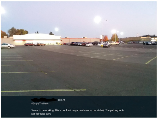 The caption following the image reads: “Seems to be working. This is our local megachurch. The parking lot is not full these days” (