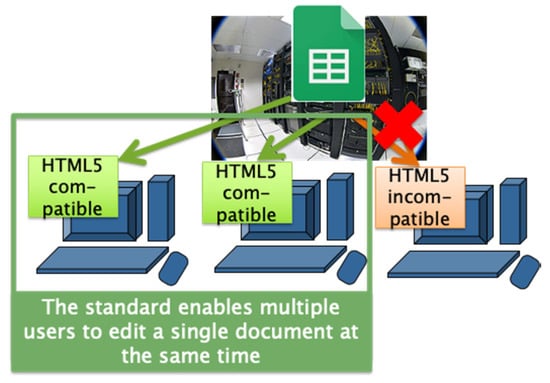 A particular focus was placed on standards that realized web applications. HTML5, the newest version of W3C’s standard, realizes "web applications," allowing applications such as spreadsheets to run on servers instead of on client hardware regardless of the type of browser used by the client (Figure 1).