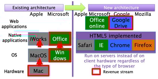 Google’s G Suite is a productivity tools including spreadsheet, word processor and presentation, and compete with Microsoft Office. Microsoft office is developed as native applications which run on operating system installed on local devices. Functions that Google intended to provide with web applications had already been provided by Microsoft as native applications. Introducing HTML5 benefits Google, and damages Microsoft.