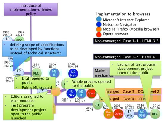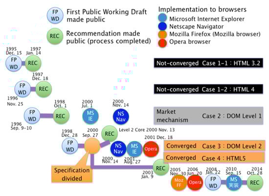 A case study approach [26] is used in this research because there are few cases of standardization involving diversified participants. Since the phenomenon of interests is emerging and under-theorized, the inductive case study approach is suitable for our research [26,27]. This case study focuses on the continuous development of the standardization process management policy at the W3C. I conducted a comparative analysis of the development process for HTML5 and its earlier versions: HTML 3.2, HTML4, and document object model (DOM) Levels 1 and 2. DOM Levels 1 and 2 are earlier specifications of HTML5’s application programming interface. This inductive hypothesis-building study attempts to develop generalizable conclusions from a rare event.