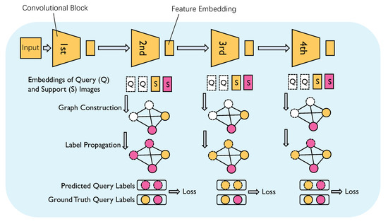 In 2017, Garcia and Bruna [22] proposed the use of a GNN for aggregating node information in an iterative fashion via a message-passing model, where the support and query images are densely connected in the graph. The edge-labeling graph neural network (EGNN) modified this approach, using edge- rather than node-label information, combined with inter-cluster dissimilarity and intra-cluster similarity measures [24]. Like GNN, the Transductive Propagation Network (TPN) considered the graph nodes for representing the feature embeddings of the images [23]. However, instead of performing inductive inference (that is, predicting test images one by one), TPN used transductive inference to predict the labels of the entire test set at once, which alleviated the low-data problem in FSL and achieved state-of-the-art performance [23].