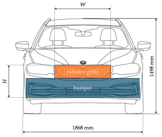 Dimensioning of the vehicle front using the technical drawing [17] of a BMW 5 Touring model as an example. We divided the front into separate radiator grille and bumper sections.