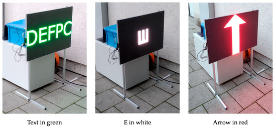 Figure 3 shows the three different content types displayed by the eHMI prototype during experiment 1 and experiment 2 (Figure 4). The text fulfills the ergonomic requirements (Section 3.2). In experiment 1, we chose to display four letters, since this number was easily readable from a distance of 88 m in a pre-test. In experiment 2, the eHMI displayed five letters (E, P, C, F, D). In both experiments, the eHMI displayed cryptic chunks of letters, so that it was hardly possible to guess the sequence of letters. To avoid the effect of varying legibility for different letters, the display showed the same letters for each participant, but in a randomized order. The letters were derived from one row of the Snellen chart. In addition to text, the prototype also displayed two types of symbols. The arrow and the “E” from the E chart were visualized in four degrees of rotation (0°, 90°, 180°, 270°) such that the limbs of the E and the arrow tip were pointing up, down, to the left, or to the right. The content size is defined throughout this article as the height of the text or the height of the arrow and the E in the orientation given in Figure 3. Even if the arrow is rotated by 90°, its size is the distance from the end of the arrow to its tip.