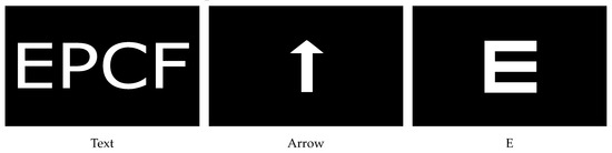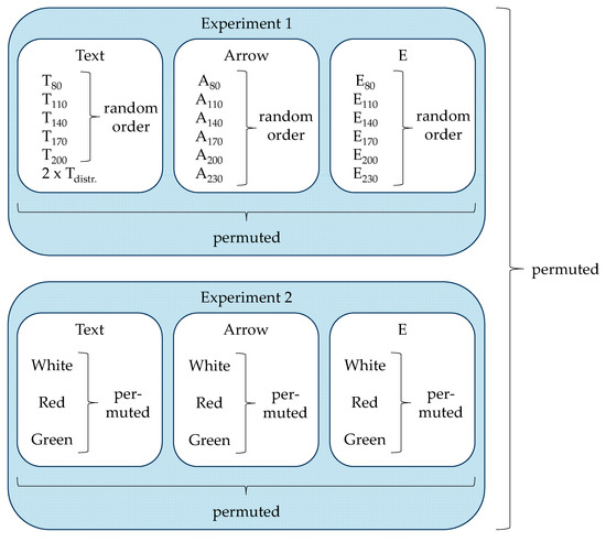 The participants performed experiment 1 and experiment 2 in a permuted order (Figure 5). In experiment 1, the participants read the text (in five different sizes), the arrow (in six different sizes), and the E (in six different sizes) in a permuted order. The text segment of the experiment also displayed two distracting text blocks, in which letters appeared twice, after the first text and after the third text, such that the participants could not assume that the respective letters only appeared once within a text. The data from these two distractor texts were not considered in the evaluation.