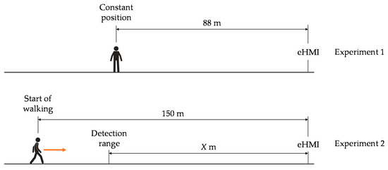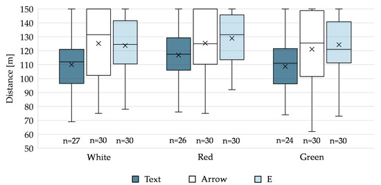Experiment 2 analyzed the effect of content type and content color on the human detection range. The size of symbols and texts was set to 164 mm, which made it possible to display five letters on the prototype. Additionally, texts and symbols were displayed in the colors white (R = 255, G = 255, B = 255), red (R = 255, G = 0, B = 0), and green (R = 0, G = 255, B = 0). We decided to use red and green in addition to white, as they are already familiar in the context of traffic as an indication of either yielding or insisting on the right of way. In experiment 2, the participants approached the eHMI prototype from a distance of 150 m. The participants stopped at a distance X from the eHMI as soon as the content type became legible and thus their detection range was attained.