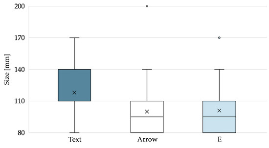 Figure 6 shows the content size from which the participants could correctly identify the contents. The text was identified correctly at a size of Mdn = 110 mm. The arrow (Mdn = 95 mm) and the E (Mdn = 95 mm) could be identified at a smaller size. The Friedman test reveals a significant effect of content type on the required content size (Χ2 = 14.59, p < 0.001, Kendall’s W = 0.549). The post-hoc comparisons using Wilcoxon tests (Table 4) show significant differences between the text and the arrow and between the text and the E, each with a large effect.