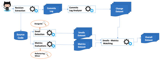 Figure 1 depicts the toolchain used for gathering the data required for conducting the analysis. The first step was the extraction of the change history of the software systems considering each commit. Specifically, all the commits log messages have been analyzed and parsed to extract all the changes performed on the files of the code repository. All the data obtained have been organized and stored in a data set.