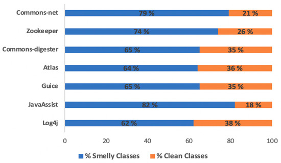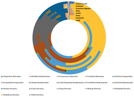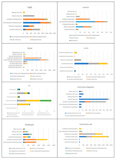- Yamashita, A.; Zanoni, M.; Fontana, F.A.; Walter, B. Inter-smell relations in industrial and open source systems: A replication and comparative analysis. In Proceedings of the 2015 IEEE International Conference on Software Maintenance and Evolution (ICSME); Institute of Electrical and Electronics Engineers (IEEE): Piscataway, NJ, USA, 2015; pp. 121–130. [Google Scholar]