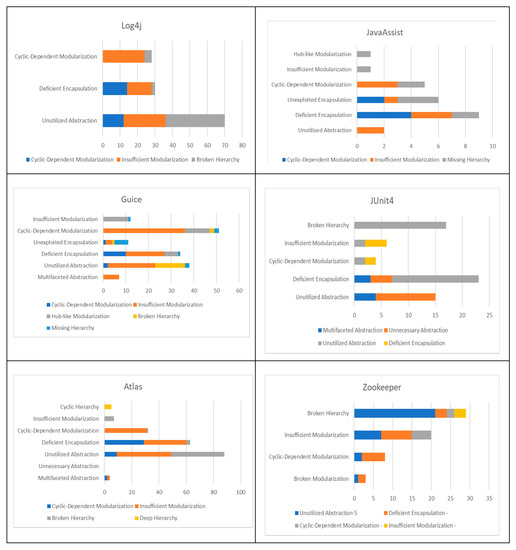 In JUnit4 it can be noted that the large part of smells removed belongs to unutilized abstraction, deficient encapsulation, cyclic-dependent modularization, insufficient modularization, and broken hierarchy smell types. In particular, the co-occurrence of refactorings is low for all the types of smell removed. In Atlas, the smells mainly removed are as follows: unutilized abstraction, deficient encapsulation and broken hierarchy, with about 10% of co-occurrence of refactorings.