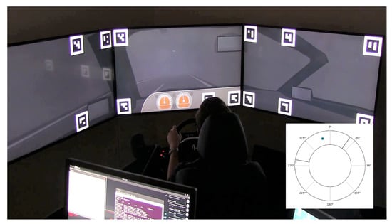 The experiment was conducted in a static driving simulator (Figure 1) with controls for steering, braking, and accelerating. Gear-shifting/transmission was set to automatic mode. Three display panels (50 inch diagonal, 1080p each, 60 Hz) presented the driving scenario and the remaining parts of the interior (dashboard, instrument cluster, mirrors), using the SILAB 5.1 driving simulation software developed by the WIVW GmbH (Würzburg Institute for Traffic Sciences, Germany). Participants wore a 120 Hz monocular eye-tracker (Pupil Labs GmbH [55]). In addition, participants wore a waist belt (feelSpace GmbH [56]) containing 16 equally spaced vibromotors (between 4.9 and 7.5 cm depending on the size of the belt). In particular, the belt contains eccentric rotation mass motors that can have a maximum amplitude of 2.2 g and a frequency spectrum of 50–240 Hz (0.45–3.3 V) triggered with a 50 ms latency. Frequency and amplitude were set to scale approximately linearly with voltage. Four belt sizes were used in the experiment to ensure a good fit for all participants. The firmware of the belt interface was customized for the experiment.
