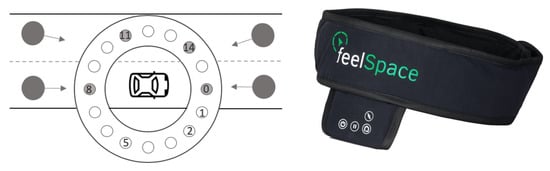 (Left) Schematic of the belt in an example situation where from every left and center lane direction an object (large gray dot) is approaching with a time to collision (TTC) value under nine seconds. Vibromotors nr. 0, 14, 8 and 11 (small grey dots) would activate in this case. If the ego-vehicle drove on the left lane, the activations would occur at vibromotor 0, 2, 5 and 8. Note that the selected vibromotors on the rear were spaced two instead of one gap apart to account for differences in spatial discriminability between dorsal and ventral regions [47,57]. (Right) Photograph of the tactile waist belt (© feelSpace GmbH).