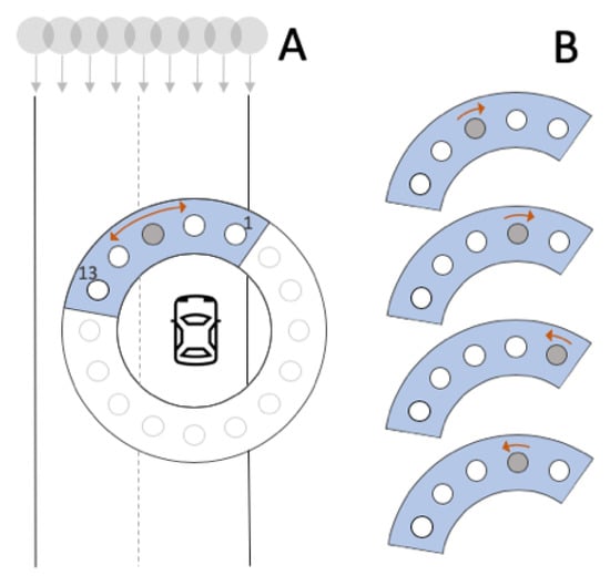Uncertainty signal for an object approaching from the front on a two-lane road (A). Grey dots indicate possible locations of the approaching vehicle as signaled by the system. The stimulus traveled between the borders and bounced back in the other direction as it hit one of the borders (B). The width of the range was chosen to be between the vibromotors that were allocated for the static signal (Figure 2) plus one extra vibromotor on each side. Thus, in the example in this image, the signal bounced between vibromotors 13 and 1.