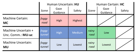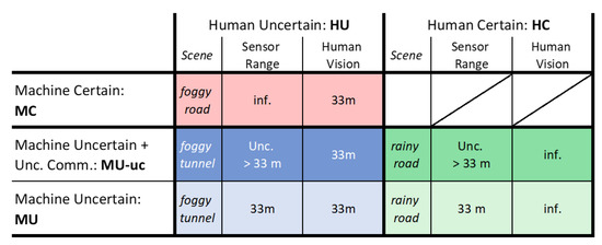 Two factors were systematically varied in the experiment in order to evaluate the proposed uncertainty communication system. First, we varied the availability of uncertainty communication (on vs. off). Second, we varied the perceptual uncertainty in the different scenarios between human and machine (machine certain-human uncertain (MC-HU), machine uncertain-human certain (MU-HC), both uncertain (MU-HU)). The uncertainty manipulation was realized through contextual conditions in the driving scenarios that aimed at independently modulating the uncertainty of the vehicle’s observations and the uncertainty of the human’s observations. Machine uncertainty was introduced by means of driving through (a) a foggy tunnel and (b) rain. Both situations would decrease sensor reliability and increase machine uncertainty. Human uncertainty was provoked by driving through (a) a foggy tunnel and (b) a foggy road. The foggy tunnel thus served as the joint uncertainty condition, in which both the human and the machine suffered from limited sensory input. Since the goal of this study was to examine the effects of uncertainty communication in human-machine cooperation, we decided to omit a condition in which both the human and the machine would be certain. In the foggy road scenario, the machine had an accurate estimate of the position of vehicles at any distance away from it, and it could always communicate the precise signal. Therefore, uncertainty communication (uc) was only available in the foggy tunnel and rain scenarios. Participants drove through these scenarios twice: once without (MU-HU, MU-HC) and once with the uncertainty communication functionality enabled (MU-HU-uc, MU-HC-uc). In case the uncertainty communication was disabled, the vibrotactile interface provided a precise signal only as soon as the approaching car entered a visible range (see Section 2.5 for details). In case the uncertainty communication was enabled, the vibrotactile interface communicated the uncertain signal whenever the defined threshold of a TTC lower than nine seconds to an approaching object was reached. This resulted in a total amount of five experimental conditions, the characteristics of which are summarized in Figure 4.