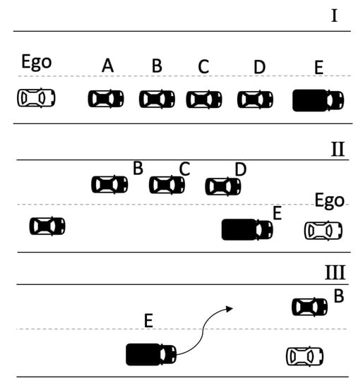 Traffic definition in the rain (machine uncertain-human certain condition (MU-HC)) scenarios. Five vehicles were driving on the right lane at 80 km/h, spaced 250 m apart (I). The ego-vehicle could maintain the target speed (120 km/h) by overtaking the vehicles. When the front truck (E) was overtaken, a trigger point was activated that made the trailing cars B, C, and D switch to the left lane, and adjust their speed to 160 km/h (II). This resulted in B, C and D eventually overtaking the ego-vehicle from the rear. When D passed the ego-vehicle (III), the leading vehicle (A) accelerated to 160 km/h, and it changed to the left lane if it came within a distance of 30 m of the ego-vehicle.