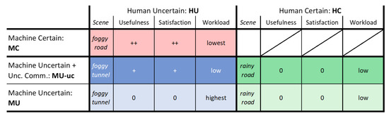 Predicted outcome of subjective evaluations according to our research hypotheses when assuming successful experimental manipulations. Usefulness and satisfaction: Symbols +,0 are used to illustrate the predicted valuation. Relative workload predictions were given verbally. For machine uncertain conditions (blue and green), the light colors mark conditions without uncertainty communication. Their dark counterparts indicate uncertainty communication.