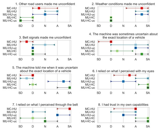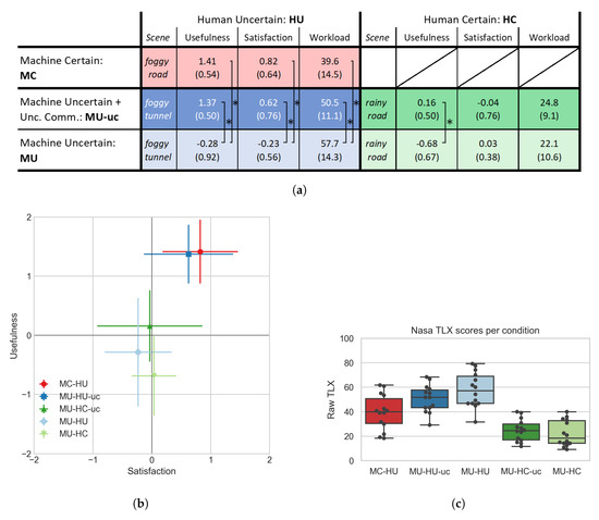 Usefulness and satisfaction scores were obtained by mapping subsets of Van Der Laan Questionnaire responses to two respective scales in the [−2, 2] range (see [65]). Figure 7 illustrates the outcome that we would expect for usefulness, satisfaction and workload under our research hypotheses H2 and H3. We expected usefulness and satisfaction to be higher in human uncertain (HU) conditions with uncertainty communication than when omitting the information. We further assumed that an advantage of the machine certain (MC—red) over the uncertainty communication (dark blue) condition should exist due to the higher information gain achievable by precise signals. On the other hand, for cases with higher human certainty (HC—green) we would expect information from an uncertainty communication to be redundant and therefore to cause no advantage over an omission of signals in the uncertainty range. However, under H3 also no disadvantage from redundant uncertainty communication was assumed.