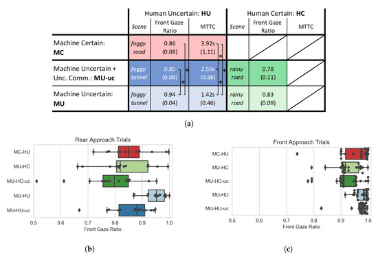 Results of objective measures for different conditions. Conditions are visually represented by distinct colors. For machine uncertain conditions (blue and green), the light colors mark conditions without uncertainty communication. Their dark counterparts indicate uncertainty communication. (a) Mean front gaze ratios and MTTC scores for each applicable condition. Standard deviations are shown in brackets. Asterisks indicate statistically significant differences between conditions linked by brackets; (b) Gaze ratio for conditions in which the machine was uncertain and for trials in which vehicles were approaching from the rear. Lower values indicate more gazing towards the mirrors. Due to failed eye tracking recordings, n = 13 (instead of 14) for all conditions; (c) Gaze ratio for conditions in which the machine was uncertain and for trials in which vehicles were approaching from the front.