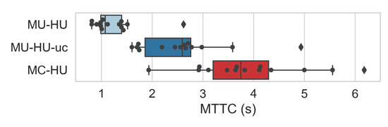 For the analysis of safety we focused on human uncertain conditions and trials in which vehicles approached from the front right lane because these trials required corrective actions by the driver to ensure safety. In line with H4 we expected safety to be highest in the machine certain (MC—red) condition, lowest in the absence of >33 m signaling (MU-HU—light blue) and intermediate with uncertainty communication enabled (MU-HU-uc—dark blue). MTTC scores (see Section 2.5.5.4) were calculated for each trial and mean MTTC scores per participant and condition were compared using a Friedmann test and post-hoc one-sided Wilcoxon signed rank tests with Bonferroni adjusted alpha levels for repeated testing.