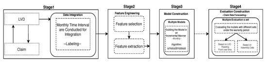 The classification algorithm consists of four stages as follows: stage 1 consists of data integration, where LVD and WC data are concatenated in a time series to be used as an input for the classification pipeline. The main purpose of this step is to label the LVD using claim information; stage 2 takes the place as a feature engineering process consisting pf feature selection to get the most informative sub-set of features, and feature extraction to generate new features from LVD to attain a valuable pattern that is conductive to a higher level of prediction performance; model construction as stage 3 is responsible to build several models based on the data collected from thousands of heavy duty trucks in different batches of productions. Finally, evaluation construction in stage 4 is in charge of assessing how the system performs in different batches of vehicle production over a year.