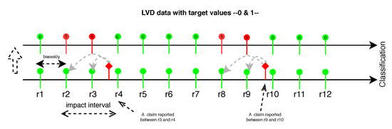 The integrated dataset contains a new feature named failure (as the target feature ). This has a value of 1 for a given row if and only if a claim for the specific component of interest has been reported. More formally, each time-window/time span is assigned a binary label according to Equation (2), where t refers to a time window (one month) that has a highest impact on failures in trucks.