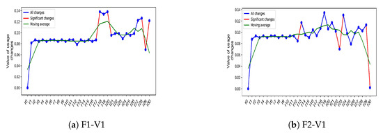 In this module, we calculate the differences between subsequent data points, and exploit them as the new features in modeling. Figure 3a,b shows the examples of significant and moderate changes, highlighted in red and blue. These subplots show the changes in two different features (F1 and F2) in a vehicle (V1). The green line in both subplots shows the average movement in the changes during the vehicle’s operation.
