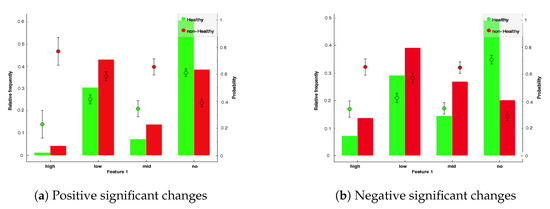 We expect that the significant change (decrease or increase) in the vehicle’s usage pattern might be correlated with a failure in the near future. Figure 4a,b show how these changes are related to the healthy and non-healthy vehicles (healthy vehicles point to those that do not have any failures during their operational life, while unhealthy refers to the vehicles that have at least one reported breakdown in their history). In these two sub-figures, the y-axis shows the relative frequency of changes in four different categories. We have quantified the numbers of those changes and divided them into four categories; high, medium, low and no changes [45]. These are shown on the x-axis. These sub-figures clearly reveal that the proportion of significant positive and negative changes in non-healthy vehicles is higher than in the healthy vehicles during their lifetimes. In contrast, the proportion of healthy vehicles is more than that of non-healthy, when we took into consideration no changes to assess the correlation between them. Similar results were observed when medium and less significant changes were taken into consideration. Basically, the findings express the message that healthy vehicles have fewer usage deviations than unhealthy vehicles. Thus, this extra information may support the model to result in more accurate predictions.