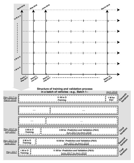 More to the point, in stage 3 (see Figure 5), we incrementally build multiple models such that the more time the vehicles are in service—e.g., one month, two months—the more LVD are considered for building the prediction model. In other words, we are incrementally adding more knowledge about vehicle usage in order to build the model to predict future failures until the end of their warranty time. Subsequently, over time, when the model exploits more LVD to train, the prediction time—here we mean the remaining time of warranty—will be decreased, since it reaches the end of the warranty period. For example, in the first iteration (e.g., for the first batch—Batch1 Figure 5—of our vehicles May-2017) we train the model with one-month vehicles LVD, and then the prediction process takes place with the data collected during the eleven months (from Jun-2017 to April-2018). In the second iteration—in this batch—the model uses two months of vehicle data in operation from May-2017 to June-2017 to be trained; accordingly, ten-months LVD from July-2017 to April-2018 are used for the validation part. These modeling and validation processes through different iterations continue until the end of the vehicles’ warranty periods. Over the year, different sorts of vehicles with various specifications have been produced in different months, so this way of modeling potentially supports the system to forecast any possible component breakdowns during the warranty period for each batch of vehicles.