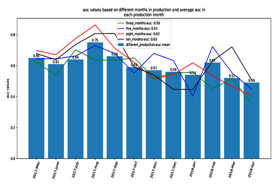 We first report how good the individual failure prediction models are across different production months. Figure 6 depicts the two ways of representation of auc values that we obtained as the prediction performance. Blue bars show the average of auc values, as obtained from eleven iterations for each production month. It can be observed that in most batches of vehicles auc values are above the random prediction . The lines show how the models perform with vehicles’ usage data with different numbers of months in operation. In fact, the lines—in different colors—represent the auc values obtained from the models, which are built based on LVD of the vehicles with different months in service/operation—such as three, five, eight and ten months—in each specific batch of production. It can be seen that, as expected, prediction based on 10-months in operation provides the best results . However, in some cases, models based on eight months in operation perform better. Although the overall auc value achieved in this experiment is not a remarkable outcome, we should keep in mind that in this prediction task, we are dealing with a very difficult problem. Given the unbalanced data and the low informativeness of the collected signals, the performance of the predictive models on an individual vehicle is not expected to be high. Overall, the figures from experiments suggest that the more data that is collected (the longer vehicles are in-service) to model and map the vehicle usage to breakdowns, the better the predictions one can achieve are.