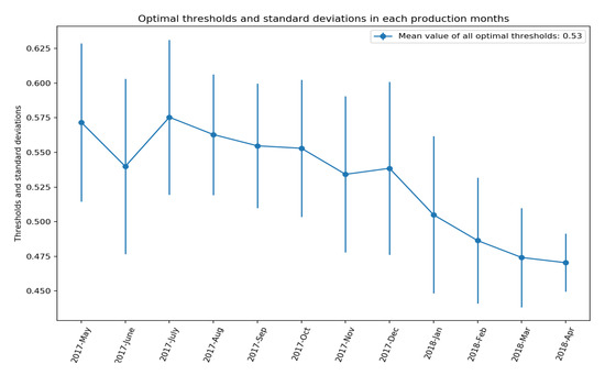 Mean values of eleventh optimal thresholds in different production months and the standard deviation of them, which were obtained from a range of possible thresholds in every iteration.