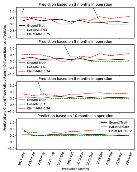 Concerning the results from classification approach, indeed it is expected to observe such poor performance with having less knowledge of vehicle usage; for instance, three or five months. The lack of this knowledge is more visible when we compare it with the result of regression approach. Figure 8 top three plots, green lines, clearly demonstrate how far the prediction using claim data is from the actual baseline—mostly from the vehicles, which are produced in 2017 with regard to the vehicles produced in 2018. In contrast, the red lines confirm the superiority of the regression using regression between failure ratio in the past to predict the failure ratios over all batches of vehicles, when three, five and eight months in operations are considered to build their models. This is reversed, however, once the classification approach gets enough usage knowledge to train the model. The bottom plot in Figure 8 depicts the overestimation of the failures ratios by the approach using only claims data; the classification performs better in all but one batches of vehicles.