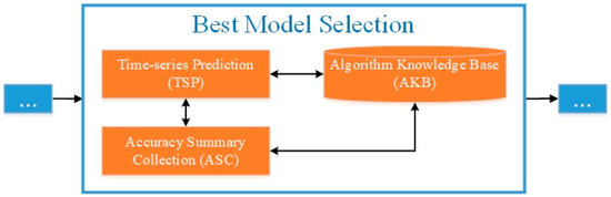 After receiving the data and finalizing the processing, it can start the best model selection, which consists of time-series prediction, algorithm knowledgebase, and accuracy summary. Specifically, time-series prediction is a process that repeats itself until it finds the best model to perform full-scale prediction on the entire data set. Time-series prediction looks at and uses the whole algorithm knowledge base that is available and compares with each other to get the best results and use what has gained the best accuracy. All results are recorded in an accuracy summary, which allows the process to determine which is the best algorithm for a particular data source. Currently, in AODPF, this process is ongoing and contains only the Kalman filter approach. The reason is that the purely simple development process is in the initial phase, and to generally understand that forecasting takes place with this method was started. As the algorithm is the only one that is not currently implemented, the autonomous selection of the algorithm from the knowledge base. However, the desired results that will be achieved in AODPF in the future can be seen in Figure 2 below.