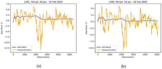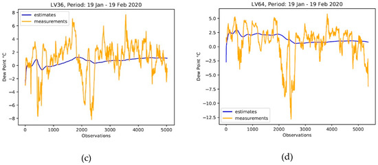 Kalman filter results of the four weather stations, (a) as “LV01”, (b) as “LV09”, (c) as “LV36” and (d) as “LV64”.