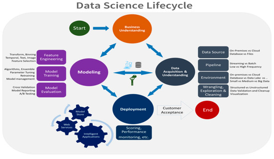Team data science process (TDSP) [28] is an agile, iterative data analysis methodology designed to produce effective predictive analytics technologies and intelligent applications. TDSP includes best practices and structures from Microsoft to help implement the data science initiatives successfully. TDSP provides the lifecycle to structure the development process of data science projects. The TDSP lifecycle has been designed for data science projects and can be used as part of intelligent applications that deploy machine learning or artificial intelligence models. In addition, this method may also help exploratory data science projects or improvised analytics projects. The lifecycle outlines the major stages that projects typically execute, often iteratively in Figure 4.