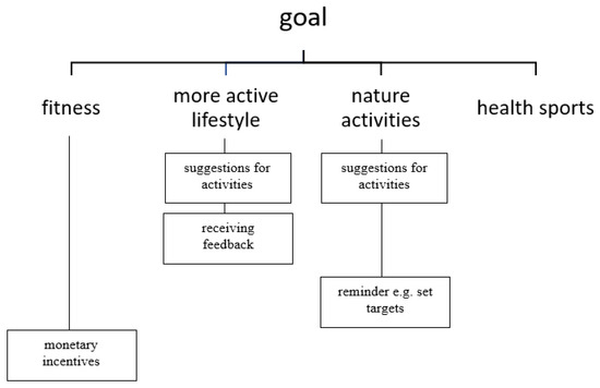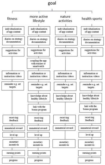According to statistical ANOVA calculations, the individualization of an app, a diary function, videos and reminder functions as well as suggestions for activities, turned out to be mandatory for all four target areas. For the target areas of fitness, nature activities and health sports, linking the app to a tracker or a smartwatch was not of interest. For the target area fitness, the acquisition of knowledge for a healthier lifestyle via an app was not relevant. A link to a bonus program was also not relevant for those interviewees who had the aim to increase their fitness and who pursued activities in nature. Gamification elements considered relevant were feedback, level ups, immaterial rewards, monetary incentives, point accumulation, and progress towards the goals of fitness improvement, more active lifestyles and more health sports. Level advancement, collecting points and progress were considered irrelevant to nature activities (Figure 2).