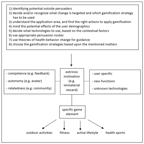 (1) Identifying potential outside persuaders, (2) deciding and/or recognizing what change is targeted and which gamification strategy has to be used based on it, (3) understanding the area of application, and finding the right actions to apply gamification, (4) being mindful of the potential effects of user demographics, (5) deciding which technologies to use, based on contextual factors, (6) using appropriate persuasion routes, (7) using theories of health behavior change for guidance, (8) choosing gamification strategies based upon the aforementioned matters. In summary, we suggest including these aspects into the development of an app to increase PA.