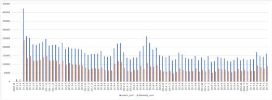 In this study, we employed the same dataset used in a previous study [18], and the key phrases used as the extraction conditions are shown in Table A1. The key phrase filter was used to extract Japanese tweets related to the Fukushima Daiichi nuclear power plant accidents from all the tweets on the Twitter platform. These key phrases were selected in collaboration with domain experts, and we aimed to collect tweets about radiation and radioactivity in relation to the Fukushima nuclear accident as comprehensively as possible. The dataset consists of all the tweets posted from 1 January 2011, to 30 June 2017. Owing to the large number of targeted tweets and budgetary constraints, we used a sample composed of 8% of the selected tweets. Each tweet analyzed contained at least one of the keywords listed in the table. This sub-sample data was purchased from NTT DATA, a Japanese multinational system integration company. In Figure 1, we show the number of tweets per month. The blue bars indicate the number of original tweets related to the Fukushima disaster, and the red bars indicate the number of retweets. As can be observed, there are still various tweets related to the disaster, even six years after the disaster, and the indicated number of retweets covers the entire sample of tweets. Furthermore, we observe that there are some influential tweets, and the retweeting behavior remains unchanged long after the event.