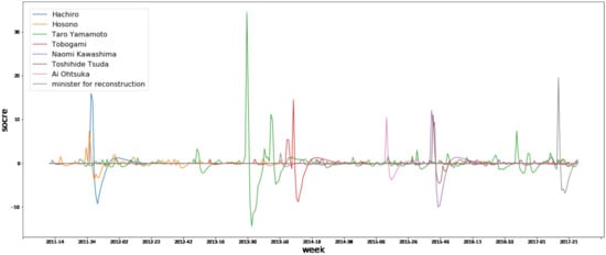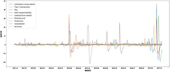 In this experiment, we applied the topic jerk detector to the dataset presented in Section 3 to detect the topics of interest to users in each period and their temporal variation. Here, we set the unit of period to one week. First, the top 100 retweeted tweets were extracted as “influential tweets” for each week, to reduce computational complexity. As mentioned in Section 2.1, Tsubokura et al. revealed that many of the tweets related to radiation and radioactivity in connection to the Fukushima disaster were retweets of tweets posted by a few hundred accounts (influencers) [18]. Next, we calculated the score for each topic using the topic jerk detector. In each period, we identified the topics that users were interested in by selecting the words with the highest calculated values. Then, it was necessary to determine four parameters () in Equations (4)–(6). To obtain the values of (), we applied the values commonly used in the technical analysis of financial markets (), and qualitatively set 3 for in this experiment. The result that we obtained from applying the topic jerk detector to our dataset is shown in Table 2, Table 3 and Table 4. We succeeded in detecting some topics that attracted the users’ interest in each period. Table 2 and Table 3 shows that the top 20 hot topics whose scores, as calculated using the method, was higher, compared to others, with the detected timing for each year. In the tables, we can see some specific persons whose remarks were picked up on Twitter, and brought to users’ attention. In Table 4, we also show, the top 10 pairs of words and timings according to the proposed method had high scores.