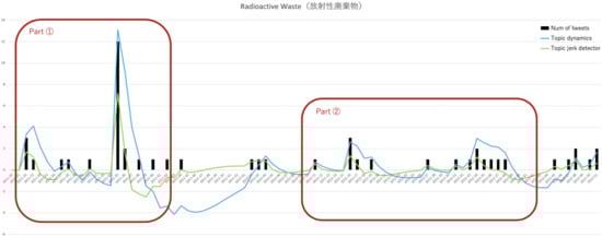 From Table 3 and Table 4, it can be said that the proposed topic jerk detector succeeded in selecting topics for each period, as Expert A said in Section 5.3. Specifically, there were some tweets to which considerable attention was paid, which included criticism of the government and detailed information on the news, with some URLs to news sites. In this ranking, “Taro Yamamoto” and “Imamura” are the individuals’ names of politicians who were strongly associated with the Fukushima disaster. This reflects the tendency, such as in flaming phenomena, that an individual’s remarks and behavior are focused on social media. The development of an interface that helps to understand this result in collaboration with our method can be considered to be an essential step for the application of our proposed method, as mentioned by Expert B in Section 5.3. In Figure 2 and Figure 3, we succeeded in plotting the scores as calculated by the topic jerk detector for some topics, and show the transition of the level of interest from users well. It is anticipated that our method will be very useful for monitoring tweets related to specific events, such as disasters, and will be useful as a reference, during the formulation of information sharing policy.