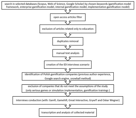 The research was divided into two stages. To verify the research questions Q1, Q2 a scoping review approach was used. Subsequently, an in-depth interview method was performed to answer the Q3 question. It was decided to combine the methods due to the complex nature of the studied area. Scoping review alone allows to isolate important elements and stages of gamification implementation from the point of view of the literature on the subject. The results will be used to construct an outline of the scenario of interviews conducted with enterprises that implement projects based on game elements. Individual interviews were chosen because of the freedom of expression, the ability to share full information without fear of duplication by the competition.