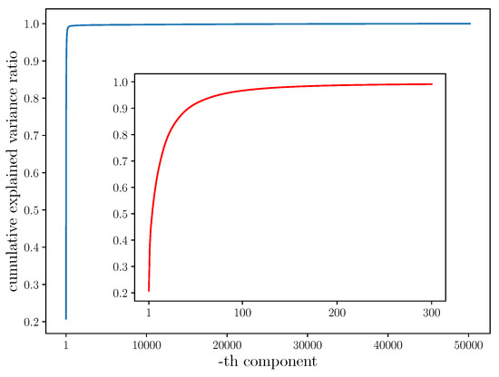 Consider a centered real matrix of size, where N is the number of samples, M is the number of variables of the data and . PCA performs eigenvalue decomposition on the covariance matrix to find eigenvectors as the components with the largest-to-smallest sorted eigenvalues . The eigenvectors and the corresponding eigenvalues are used to explain the variance in the data with explained variance ratio . However, it is hard for us to operate eigenvalue decomposition on our training set directly where 175,000 and 50,176. Therefore, we apply singular value decomposition (SVD) on the centered training set alternatively. SVD gives , where and are orthogonal matrices, and is an diagonal matrix of singular values . In practice, the computation can drop the matrices and , and only store the diagonal matrix as an array with M size. Letting the singular values be in the order , we can obtain the eigenvalues of by
