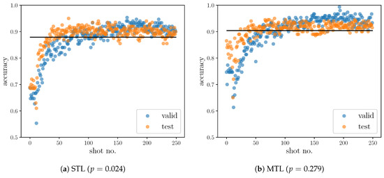 The comparison of ACC of Power Classification over each shot no. between (a) STL and (b) MTL is significantly different (p < 0.001). The black lines denote the ACC over the validation and test sets.