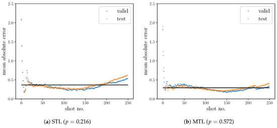 The comparison of MAE of Shot No. Regression over each shot no. between (a) STL and (b) MTL is significantly different as well (p < 0.001). The black lines denote the MAE over the validation and test sets.