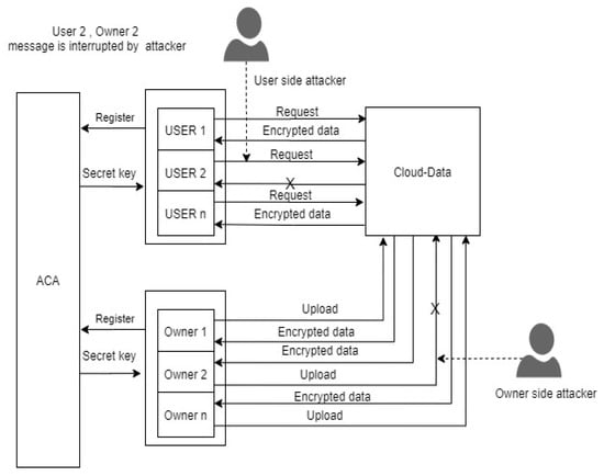 Security is considered one of the most significant obstacles for cloud computing [], making it a massive challenge for the organizations that provide various cloud services to the users. The security of data in a cloud is mainly about preserving its integrity, confidentiality, and privacy. As a cloud accumulates more and more data, the threats and risks from hackers and cybercriminals also increase proportionally. The hackers can break into all kinds of public, private, or hybrid cloud computing environments []. Several security schemes have been proposed in the past for efficient and secure data sharing on untrusted servers. In all of these approaches, the encrypted data files are stored on untrusted storage space, and the data owners [] distribute the corresponding decryption keys only to the authorized users. The most common form of attack that is observed in the cloud environment is Man in the Middle (MITM) attack. In MITM attacks, the attacker attempts to intercept the messages that are generated during the exchange of a public key and echo them. Then they substitute those keys with a new key of their own to deceit the steps involved in the processing of the user’s request [,]. During the attack process, it still appears as if the two parties that are the user and cloud are continuously communicating with each other. The message sender does not get any clue that the receiver is a hacker trying to access or modify the message before retransmitting it to the receiver.
