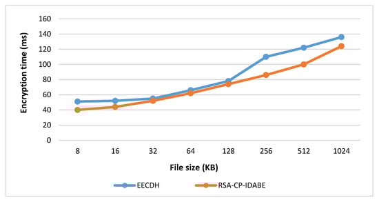 The encryption time is the time taken for encrypting the data through the cryptic mechanism in the cloud security framework. The encryption time generally depends on the size of data that is to be encrypted. In the proposed RSA-CP-IDABE scheme, the encryption time for 8-KB data is 40 ms, and for 1024-KB data, it is 124 ms. However, for the existing Enhanced Elliptical Curve Diffie Hellman (EECDH) algorithm [], the time taken for encrypting 8-KB data is 51 ms, and 1024-KB is 136 ms, respectively. The comparison between the proposed RSA-CP-IDABE and existing EECDH [] is given in Table 2 and Figure 3.