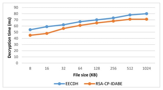 The decryption time is the time taken by the owner or the user to decrypt the data using the proposed algorithm. For the proposed RSA-CP-IDABE, the decryption time for 8-KB and 1024-KB data is about 45 ms and 71 ms, respectively. The comparison between the proposed RSA-CP-IDABE and the existing EECDH over decoding different file sizes is given in Table 3 and Figure 4. The existing EECDH [] takes 54 ms and 80 ms for decrypting the 8-KB and 1024-KB data, respectively. The comparison between the proposed RSA-CP-IDABE and the existing EECDH over decoding different file sizes are given in Table 3 and Figure 4.