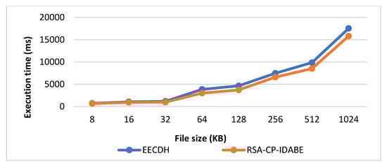 The execution time is the total time taken to secure the data in the cloud environment. The execution time includes the key generation time, encryption time, uploading time, downloading time, decryption time, and verification time. The execution time over the 8-KB and 1024-KB data is about 725 ms and 17,523 ms, respectively, for the existing EECDH []. In comparison, the proposed RSA-CP-IDABE has an execution time of 675 ms and 15,792 ms for 8-KB and 1024-KB data, respectively. Table 4 and Figure 5 shows the comparison of performances between the RSA-CP-IDABE and EECDH [].