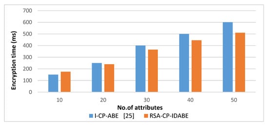 It is observed in Table 5 that both the encryption and decryption time of the proposed approach is higher than the Improved CP-ABE (I-CP-ABE) [] when the number of attributes is less. However, when there is an increase in the attributes, the difference between the times decreases, and it was observed that the proposed RSA-CP-IDABE is better than the existing I-CP-ABE, as shown in Figure 6 and Figure 7.