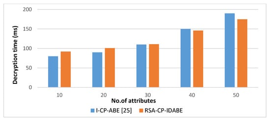 Comparison between the proposed RSA-CP-IDABE and I-CP-ABE for decryption time.