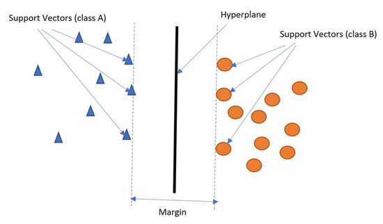Support vector machines (SVM) is a supervised machine learning algorithm for solving regression and classification problems with the latter been used predominantly. It has the capability of detecting complex hidden patterns. The robustness of SVM and its ability to integrate with kernel-based learning makes SVMs a more flexible analysis and optimized solution for classification problems [26]. For two dimensional data, SVM works by trying to divide the two classes of data by a hyperplane the splits the classes in the best possible way. This maximizes the distance between the nearest points (support vectors) to the hyperplane on both classes thereby maximizing the margin between the support vectors on both sides. This is illustrated in Figure 1. This becomes a constrained optimization problem which can be solved using Lagrange multipliers.